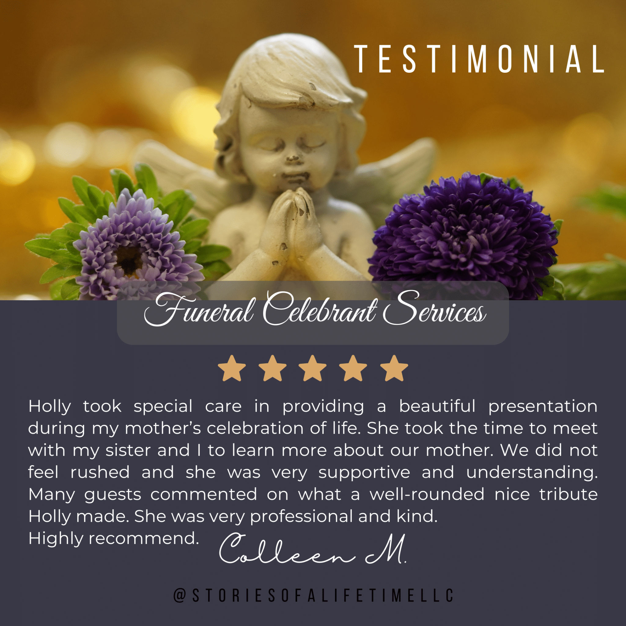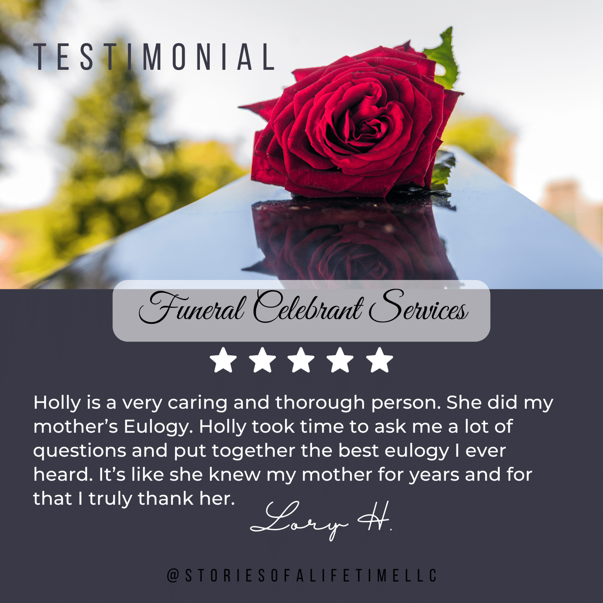 Celebrating lives that have been lived is the heart of Stories of A Lifetime. When a loved one passes, take the burden off of yourself and entrust Celebrant Holly to write and officiate a personalized and meaningful Celebration of Life Service that honors the life being memorialized.
