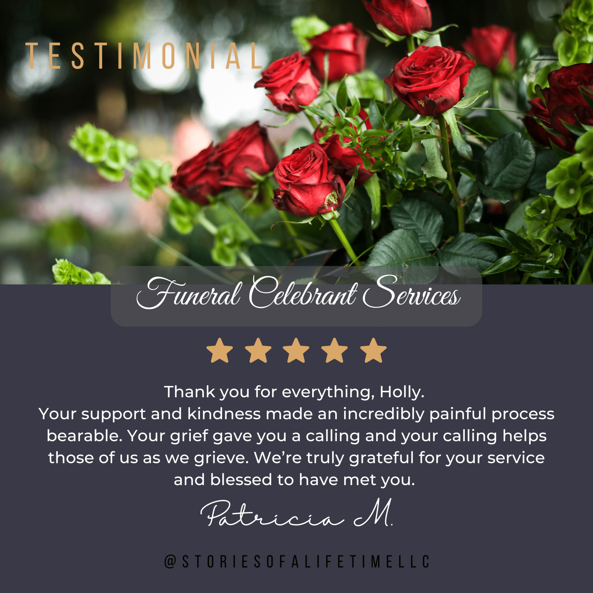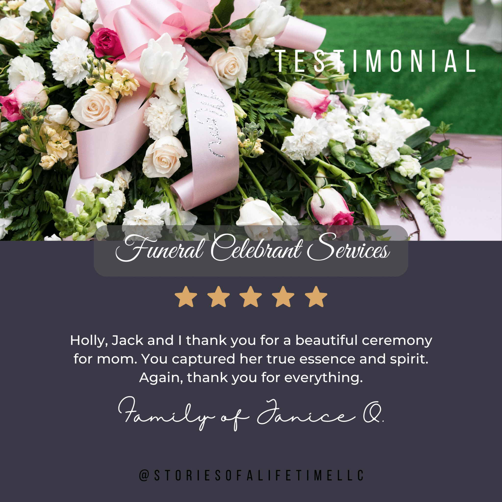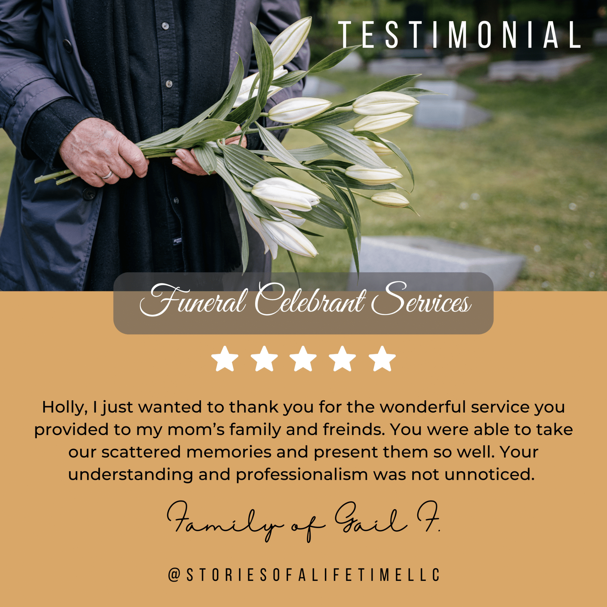 Stories of A Lifetime can serve you and your family whether you have chosen traditional burial or cremation options with many different Celebrations of Life including religious or non-religious services, military services, scattering ceremonies, bench/marker unveilings, services of remembrance, vigils, graveside services, committals, obituary writing, and memorial anniversaries of a death/birthday/life event.